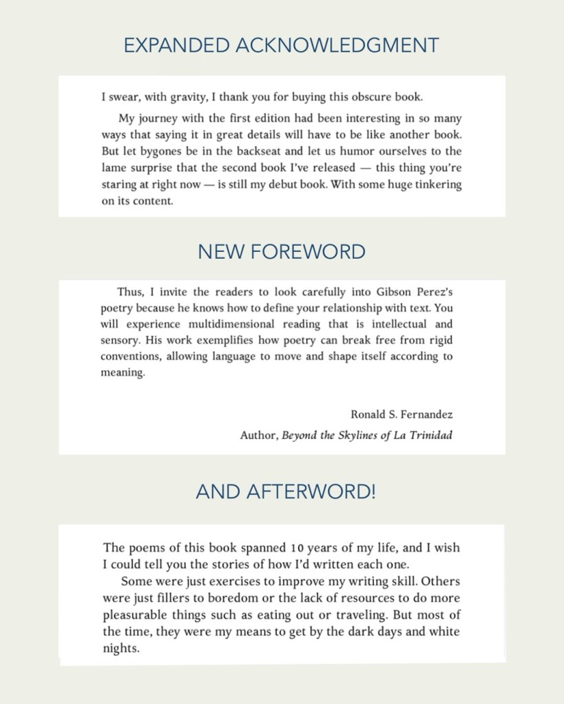 Two good things happened though. I got to meet new people, and I discovered that I didn’t just want to write a book. I also wanted to create it. I have to mention that the entirety of this second edition (e.g., its content, format, and design) was all done by me. If only I have the money, I will buy my own machine to print and bind the copies — and buy the copies themselves. Lol.
